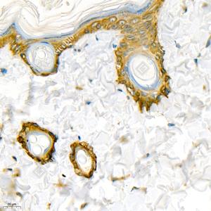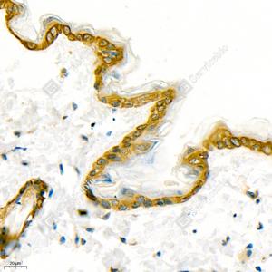 | IHC检测Cytokeratin 6蛋白(货号 GB11838). 样品: 小鼠皮肤, 4%多聚甲醛 (货号G1101) 固定12-24小时. 抗原修复: 柠檬酸抗原修复液(干粉, pH 6.0) (G1201), 98℃, 20分钟. —抗: 1: 800稀释, 4℃ 孵育过夜. 二抗: HRP标记山羊抗兔IgG (H+L) (货号GB23303), 1: 200稀释, 室温孵育1小时. |