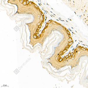 | IHC检测Cytokeratin 6蛋白(货号 GB11838). 样品: 大鼠皮肤, 4%多聚甲醛 (货号G1101) 固定12-24小时. 抗原修复: 柠檬酸抗原修复液(干粉, pH 6.0) (G1201), 98℃, 20分钟. —抗: 1: 800稀释, 4℃ 孵育过夜. 二抗: HRP标记山羊抗兔IgG (H+L) (货号GB23303), 1: 200稀释, 室温孵育1小时. |