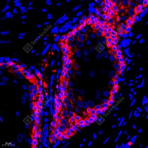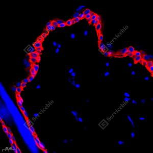 | IF检测Cytokeratin 6蛋白(货号 GB11838)(红色). 样品: 大鼠胃, 4%多聚甲醛 (货号G1101) 固定12-24小时. 抗原修复: Tris-EDTA抗原修复液(pH 9.0) (G1203), 98℃, 20分钟. 封闭: 3% BSA(货号GC305010)的PBS溶液, 室温孵育30分钟. —抗: 1: 1000稀释, 4℃ 孵育过夜. 二抗: Cy3标记山羊抗兔IgG (H+L) (货号GB21303), 1: 300稀释, 室温孵育1小时. |