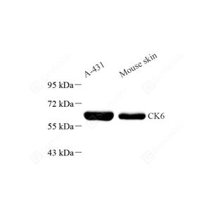 WB检测Cytokeratin 6蛋白(货号 GB111247). 样品: 经RIPA裂解液(货号G2002)处理的蛋白质. 封闭: 3%脱脂牛奶(货号GC310001)溶于TBST溶液, 室温孵育1小时. —抗: 1: 1000稀释, 4℃ 孵育过夜. 二抗: HRP标记山羊抗兔IgG (H+L) (货号GB23303), 1: 5000稀释, 室温孵育1小时. |