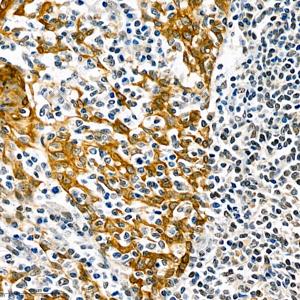 IHC检测Cytokeratin 6蛋白(货号 GB111247). 样品: 人扁桃体, 4%多聚甲醛 (货号G1101) 固定12-24小时. 抗原修复: 柠檬酸抗原修复液(干粉, pH 6.0) (G1201), 98℃, 20分钟. —抗: 1: 1000稀释, 4℃ 孵育过夜. 二抗: HRP标记山羊抗兔IgG (H+L) (货号GB23303), 1: 200稀释, 室温孵育1小时. |