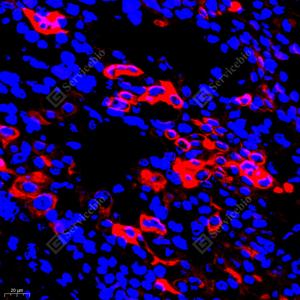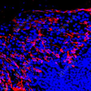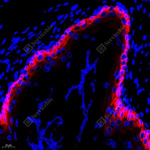 IF检测Cytokeratin 6蛋白(货号 GB111247)(红色). 样品: 人扁桃体, 4%多聚甲醛 (货号G1101) 固定12-24小时. 抗原修复: Tris-EDTA抗原修复液(pH 9.0) (G1203), 98℃, 20分钟. 封闭: 3% BSA(货号GC305010)的PBS溶液, 室温孵育30分钟. —抗: 1: 2000稀释, 4℃ 孵育过夜. 二抗: Cy3标记山羊抗兔IgG (H+L) (货号GB21303), 1: 300稀释, 室温孵育1小时. |