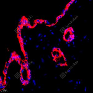 IF检测Cytokeratin 6蛋白(货号 GB111247)(红色). 样品: 人卵巢癌, 4%多聚甲醛 (货号G1101) 固定12-24小时. 抗原修复: Tris-EDTA抗原修复液(pH 9.0) (G1203), 98℃, 20分钟. 封闭: 3% BSA(货号GC305010)的PBS溶液, 室温孵育30分钟. —抗: 1: 2000稀释, 4℃ 孵育过夜. 二抗: Cy3标记山羊抗兔IgG (H+L) (货号GB21303), 1: 300稀释, 室温孵育1小时. |