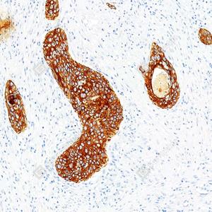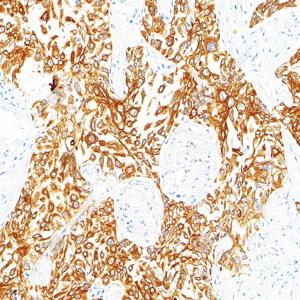 IHC检测Cytokeratin 1蛋白(货号 GB151018). 样品: 人肺鳞状细胞癌, 4%多聚甲醛 (货号G1101) 固定12-24小时. 抗原修复: 柠檬酸抗原修复液(干粉, pH 6.0) (G1201), 高压锅均匀喷气计时2分钟. —抗: 1: 1000稀释, 4℃ 孵育过夜. 二抗: S-vision免疫组化多聚二抗(山羊抗兔),即用型 (货号G1302), 室温孵育20分钟. |