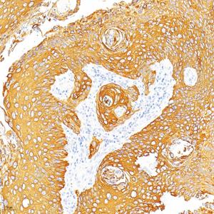 IHC检测Cytokeratin 1蛋白(货号 GB151018). 样品: 人喉鳞状细胞癌, 4%多聚甲醛 (货号G1101) 固定12-24小时. 抗原修复: 柠檬酸抗原修复液(干粉, pH 6.0) (G1201), 高压锅均匀喷气计时2分钟. —抗: 1: 1000稀释, 4℃ 孵育过夜. 二抗: S-vision免疫组化多聚二抗(山羊抗兔),即用型 (货号G1302), 室温孵育20分钟. |