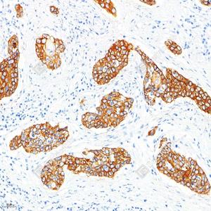 IHC检测Cytokeratin 1蛋白(货号 GB151018). 样品: 人宫颈癌, 4%多聚甲醛 (货号G1101) 固定12-24小时. 抗原修复: 柠檬酸抗原修复液(干粉, pH 6.0) (G1201), 高压锅均匀喷气计时2分钟. —抗: 1: 1000稀释, 4℃ 孵育过夜. 二抗: S-vision免疫组化多聚二抗(山羊抗兔),即用型 (货号G1302), 室温孵育20分钟. |