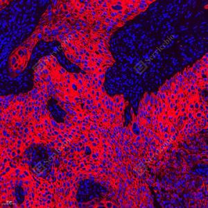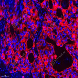 IF检测Cytokeratin 1蛋白(货号 GB151018)(红色). 样品: 人喉鳞状细胞癌, 4%多聚甲醛 (货号G1101) 固定12-24小时. 抗原修复: 柠檬酸抗原修复液(干粉, pH 6.0) (G1201), 高压锅均匀喷气计时2分钟. 封闭: 3% BSA(货号GC305010)的PBS溶液, 室温孵育30分钟. —抗: 1: 1000稀释, 4℃ 孵育过夜. 二抗: Cy3标记山羊抗兔IgG (H+L) (货号GB21303), 1: 300稀释, 室温孵育1小时. |