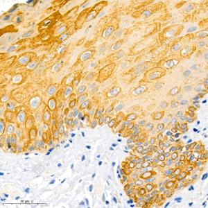 IHC检测Cytokeratin 1蛋白(货号 GB111277). 样品: 大鼠口腔粘膜, 4%多聚甲醛 (货号G1101) 固定12-24小时. 抗原修复: 柠檬酸抗原修复液(干粉, pH 6.0) (G1201), 98℃, 20分钟. —抗: 1: 2000稀释, 4℃ 孵育过夜. 二抗: HRP标记山羊抗兔IgG (H+L) (货号GB23303), 1: 200稀释, 室温孵育1小时. |