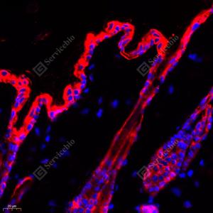 IF检测Cytokeratin 1蛋白(货号 GB111277)(红色). 样品: 小鼠皮肤, 4%多聚甲醛 (货号G1101) 固定12-24小时. 抗原修复: Tris-EDTA抗原修复液(pH 9.0) (G1203), 98℃, 20分钟. 封闭: 3% BSA(货号GC305010)的PBS溶液, 室温孵育30分钟. —抗: 1: 2000稀释, 4℃ 孵育过夜. 二抗: Cy3标记山羊抗兔IgG (H+L) (货号GB21303), 1: 300稀释, 室温孵育1小时. |