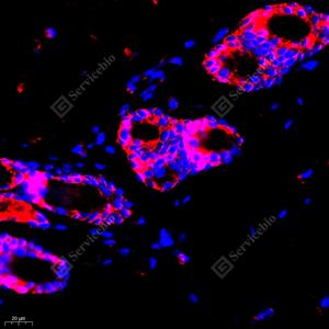 IF检测Cytokeratin 1蛋白(货号 GB111277)(红色). 样品: 大鼠皮肤, 4%多聚甲醛 (货号G1101) 固定12-24小时. 抗原修复: Tris-EDTA抗原修复液(pH 9.0) (G1203), 98℃, 20分钟. 封闭: 3% BSA(货号GC305010)的PBS溶液, 室温孵育30分钟. —抗: 1: 2000稀释, 4℃ 孵育过夜. 二抗: Cy3标记山羊抗兔IgG (H+L) (货号GB21303), 1: 300稀释, 室温孵育1小时. |