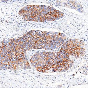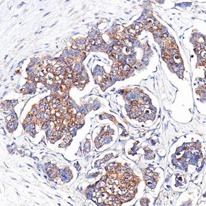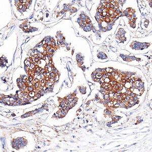 | IHC检测Cytokeratin 1蛋白(货号 GB151277). 样品: 人乳腺癌, 4%多聚甲醛 (货号G1101) 固定12-24小时. 抗原修复: 抗原修复仪(货号 ARI-4), Tris-EDTA抗原修复液(pH 9.0) (货号G1203), 水浴100℃, 25分钟. —抗: 1: 1000稀释, 4℃ 孵育过夜. 二抗: S-vision免疫组化多聚二抗(山羊抗兔),即用型 (货号G1302), 室温孵育20分钟. |