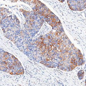 | IHC检测Cytokeratin 1蛋白(货号 GB151277). 样品: 人食管癌, 4%多聚甲醛 (货号G1101) 固定12-24小时. 抗原修复: 抗原修复仪(货号 ARI-4), Tris-EDTA抗原修复液(pH 9.0) (货号G1203), 水浴100℃, 25分钟. —抗: 1: 1000稀释, 4℃ 孵育过夜. 二抗: S-vision免疫组化多聚二抗(山羊抗兔),即用型 (货号G1302), 室温孵育20分钟. |