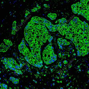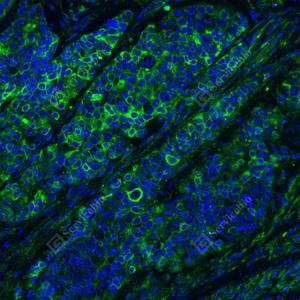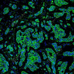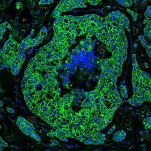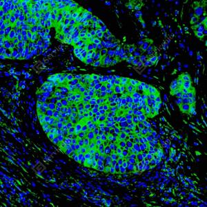 | IF检测Cytokeratin 1蛋白(货号 GB151277)(绿色). 样品: 人乳腺癌, 4%多聚甲醛 (货号G1101) 固定12-24小时. 抗原修复: 抗原修复仪(货号 ARI-4), Tris-EDTA抗原修复液(pH 9.0) (货号G1203), 水浴100℃, 25分钟. 封闭: 3% BSA(货号GC305010)的PBS溶液, 室温孵育30分钟. —抗: 1: 1000稀释, 4℃ 孵育过夜. 二抗: Alexa Fluor 488标记山羊抗兔IgG (H+L) (货号GB25303), 1: 400稀释, 室温孵育1小时. |
