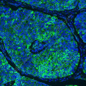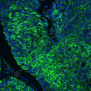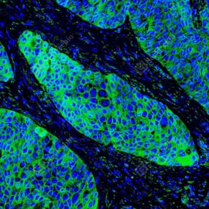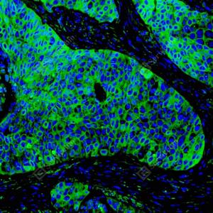 | IF检测Cytokeratin 1蛋白(货号 GB151277)(绿色). 样品: 人食管癌, 4%多聚甲醛 (货号G1101) 固定12-24小时. 抗原修复: 抗原修复仪(货号 ARI-4), Tris-EDTA抗原修复液(pH 9.0) (货号G1203), 水浴100℃, 25分钟. 封闭: 3% BSA(货号GC305010)的PBS溶液, 室温孵育30分钟. —抗: 1: 1000稀释, 4℃ 孵育过夜. 二抗: Alexa Fluor 488标记山羊抗兔IgG (H+L) (货号GB25303), 1: 400稀释, 室温孵育1小时. |
