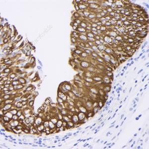 IHC检测Cytokeratin 13蛋白(货号 GB12801). 样品: 人膀胱癌, 4%多聚甲醛 (货号G1101) 固定12-24小时. 抗原修复: 柠檬酸抗原修复液(干粉, pH 6.0) (G1201), 高压锅均匀喷气计时2分钟. —抗: 1: 500稀释, 4℃ 孵育过夜. 二抗: HRP标记山羊抗小鼠IgG (H+L) (货号GB23301), 1: 200稀释, 室温孵育1小时. |