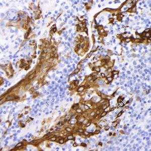 IHC检测Cytokeratin 13蛋白(货号 GB12801). 样品: 人扁桃体, 4%多聚甲醛 (货号G1101) 固定12-24小时. 抗原修复: 柠檬酸抗原修复液(干粉, pH 6.0) (G1201), 高压锅均匀喷气计时2分钟. —抗: 1: 500稀释, 4℃ 孵育过夜. 二抗: HRP标记山羊抗小鼠IgG (H+L) (货号GB23301), 1: 200稀释, 室温孵育1小时. |