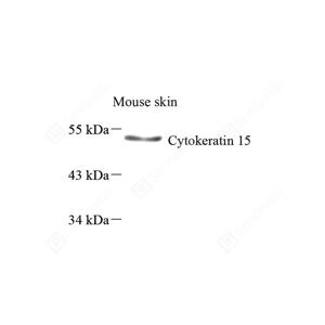WB检测Cytokeratin 15蛋白(货号 GB121648). 样品: 经RIPA裂解液(货号G2002)处理的蛋白质. 封闭: 3%脱脂牛奶(货号GC310001)溶于TBST溶液, 室温孵育1小时. —抗: 1: 1000稀释, 4℃ 孵育过夜. 二抗: HRP标记山羊抗小鼠IgG (H+L) (货号GB23301), 1: 5000稀释, 室温孵育1小时. |