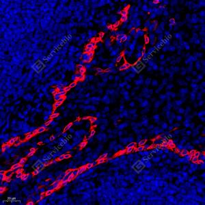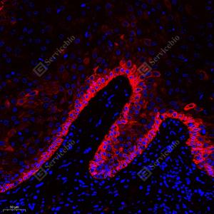 IF检测Cytokeratin 15蛋白(货号 GB121648)(红色). 样品: 人扁桃体, 4%多聚甲醛 (货号G1101) 固定12-24小时. 抗原修复: 柠檬酸抗原修复液(干粉, pH 6.0) (G1201), 高压锅均匀喷气计时2分钟. 封闭: 3% BSA(货号GC305010)的PBS溶液, 室温孵育30分钟. —抗: 1: 500稀释, 4℃ 孵育过夜. 二抗: Cy3标记山羊抗小鼠IgG (H+L) (货号GB21301), 1: 300稀释, 室温孵育1小时. |