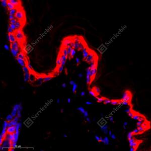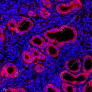 IF检测Cytokeratin 13蛋白(货号 GB11801)(红色). 样品: 小鼠子宫, 4%多聚甲醛 (货号G1101) 固定12-24小时. 抗原修复: Tris-EDTA抗原修复液(pH 9.0) (G1203), 98℃, 20分钟. 封闭: 3% BSA(货号GC305010)的PBS溶液, 室温孵育30分钟. —抗: 1: 500稀释, 4℃ 孵育过夜. 二抗: Cy3标记山羊抗兔IgG (H+L) (货号GB21303), 1: 300稀释, 室温孵育1小时. |
