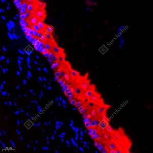 IF检测Cytokeratin 13蛋白(货号 GB11801)(红色). 样品: 大鼠皮肤, 4%多聚甲醛 (货号G1101) 固定12-24小时. 抗原修复: Tris-EDTA抗原修复液(pH 9.0) (G1203), 98℃, 20分钟. 封闭: 3% BSA(货号GC305010)的PBS溶液, 室温孵育30分钟. —抗: 1: 500稀释, 4℃ 孵育过夜. 二抗: Cy3标记山羊抗兔IgG (H+L) (货号GB21303), 1: 300稀释, 室温孵育1小时. |