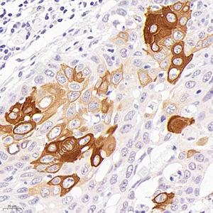 IHC检测Cytokeratin 16/K16蛋白(货号 GB12805). 样品: 人食管癌, 4%多聚甲醛 (货号G1101) 固定12-24小时. 抗原修复: 柠檬酸抗原修复液(干粉, pH 6.0) (G1201), 高压锅均匀喷气计时2分钟. —抗: 1: 1000稀释, 4℃ 孵育过夜. 二抗: HRP标记山羊抗小鼠IgG (H+L) (货号GB23301), 1: 200稀释, 室温孵育1小时. |