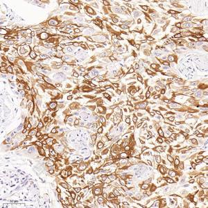 IHC检测Cytokeratin 16/K16蛋白(货号 GB12805). 样品: 人肺癌, 4%多聚甲醛 (货号G1101) 固定12-24小时. 抗原修复: 柠檬酸抗原修复液(干粉, pH 6.0) (G1201), 高压锅均匀喷气计时2分钟. —抗: 1: 1000稀释, 4℃ 孵育过夜. 二抗: HRP标记山羊抗小鼠IgG (H+L) (货号GB23301), 1: 200稀释, 室温孵育1小时. |