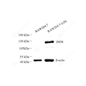 | WB检测iNOS蛋白(货号 GB113965). 样品: 经RIPA裂解液(货号G2002)处理的蛋白质. 封闭: 封闭: 3%脱脂牛奶(货号GC310001)溶于TBST溶液, 室温孵育1小时. —抗: 1: 1000稀释, 4℃ 孵育过夜. 二抗: HRP标记山羊抗兔IgG (H+L) (货号GB23303), 1: 5000稀释, 室温孵育1小时. |