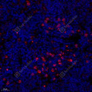 | IF检测iNOS蛋白(货号 GB11119)(红色). 样品: 小鼠脾, 4%多聚甲醛 (货号G1101) 固定12-24小时. 抗原修复: Tris-EDTA抗原修复液(pH 9.0) (G1203), 98℃, 20分钟. 封闭: 3% BSA(货号GC305010)的PBS溶液, 室温孵育30分钟. —抗: 1: 500稀释, 4℃ 孵育过夜. 二抗: Cy3标记山羊抗兔IgG (H+L) (货号GB21303), 1: 300稀释, 室温孵育1小时. |