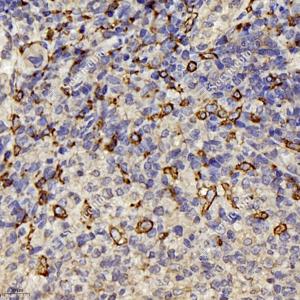 IHC检测CD163蛋白(货号 GB11340-1). 样品: 小鼠脾, 4%多聚甲醛 (货号G1101) 固定12-24小时. 抗原修复: 柠檬酸抗原修复液(干粉, pH 6.0) (G1201), 98℃, 20分钟. —抗: 1: 200稀释, 4℃ 孵育过夜. 二抗: HRP标记山羊抗兔IgG (H+L) (货号GB23303), 1: 200稀释, 室温孵育1小时. |