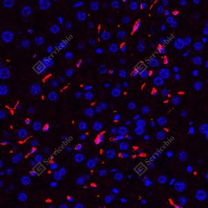 IF检测CD163蛋白(货号 GB11340-1)(红色). 样品: 小鼠肝, 4%多聚甲醛 (货号G1101) 固定12-24小时. 抗原修复: Tris-EDTA抗原修复液(pH 9.0) (G1203), 98℃, 20分钟. 封闭: 3% BSA(货号GC305010)的PBS溶液, 室温孵育30分钟. —抗: 1: 800稀释, 4℃ 孵育过夜. 二抗: Cy3标记山羊抗兔IgG (H+L) (货号GB21303), 1: 300稀释, 室温孵育1小时. |