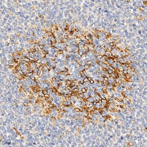 IHC检测Sialoadhesin/CD169蛋白(货号 GB111685). 样品: 大鼠脾, 4%多聚甲醛 (货号G1101) 固定12-24小时. 抗原修复: 柠檬酸抗原修复液(干粉, pH 6.0) (G1201), 98℃, 20分钟. —抗: 1: 700稀释, 4℃ 孵育过夜. 二抗: HRP标记山羊抗兔IgG (H+L) (货号GB23303), 1: 200稀释, 室温孵育1小时. |