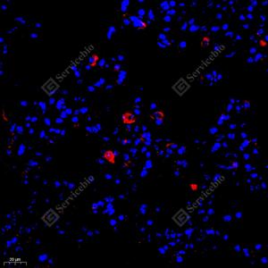 IF检测Sialoadhesin/CD169蛋白(货号 GB111685)(红色). 样品: 小鼠肺, 4%多聚甲醛 (货号G1101) 固定12-24小时. 抗原修复: Tris-EDTA抗原修复液(pH 9.0) (G1203), 98℃, 20分钟. 封闭: 3% BSA(货号GC305010)的PBS溶液, 室温孵育30分钟. —抗: 1: 700稀释, 4℃ 孵育过夜. 二抗: Cy3标记山羊抗兔IgG (H+L) (货号GB21303), 1: 300稀释, 室温孵育1小时. |