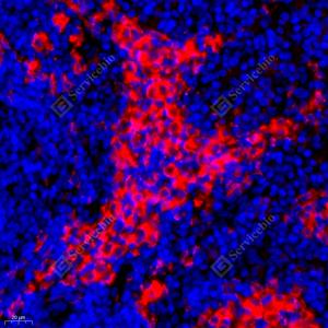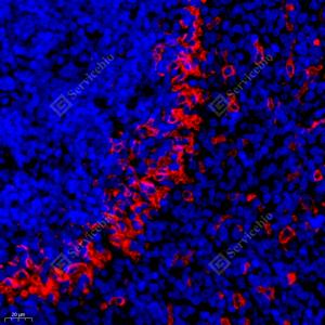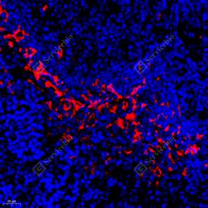 IF检测Sialoadhesin/CD169蛋白(货号 GB111685)(红色). 样品: 大鼠淋巴结, 4%多聚甲醛 (货号G1101) 固定12-24小时. 抗原修复: Tris-EDTA抗原修复液(pH 9.0) (G1203), 98℃, 20分钟. 封闭: 3% BSA(货号GC305010)的PBS溶液, 室温孵育30分钟. —抗: 1: 700稀释, 4℃ 孵育过夜. 二抗: Cy3标记山羊抗兔IgG (H+L) (货号GB21303), 1: 300稀释, 室温孵育1小时. |
