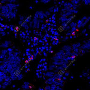 | IF检测CD8 alpha蛋白(货号 GB154196)(红色). 样品: 人结肠癌, 4%多聚甲醛 (货号G1101) 固定12-24小时. 抗原修复: 柠檬酸抗原修复液(干粉, pH 6.0) (G1201), 高压锅均匀喷气计时2分钟. 封闭: 3% BSA(货号GC305010)的PBS溶液, 室温孵育30分钟. —抗: 1: 500稀释, 4℃ 孵育过夜. 二抗: Cy3标记山羊抗小鼠IgG (H+L) (货号GB21301), 1: 300稀释, 室温孵育1小时. |