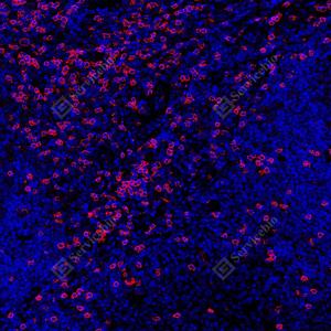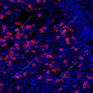 | IF检测CD8 alpha蛋白(货号 GB154196)(红色). 样品: 人扁桃体, 4%多聚甲醛 (货号G1101) 固定12-24小时. 抗原修复: 柠檬酸抗原修复液(干粉, pH 6.0) (G1201), 高压锅均匀喷气计时2分钟. 封闭: 3% BSA(货号GC305010)的PBS溶液, 室温孵育30分钟. —抗: 1: 500稀释, 4℃ 孵育过夜. 二抗: Cy3标记山羊抗小鼠IgG (H+L) (货号GB21301), 1: 300稀释, 室温孵育1小时. |