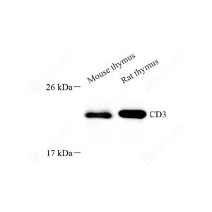 WB检测CD3蛋白(货号 GB111337). 样品: 经RIPA裂解液(货号G2002)处理的蛋白质. 封闭: 3%脱脂牛奶(货号GC310001)溶于TBST溶液, 室温孵育1小时. —抗: 1: 1000稀释, 4℃ 孵育过夜. 二抗: HRP标记山羊抗兔IgG (H+L) (货号GB23303), 1: 5000稀释, 室温孵育1小时. |