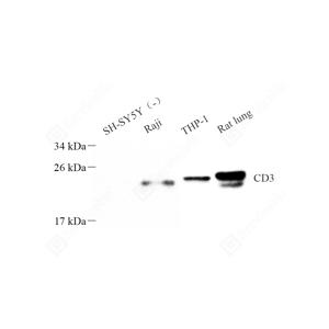 | WB检测CD3蛋白(货号 GB11014). 样品: 经RIPA裂解液(货号G2002)处理的蛋白质. 封闭: 3%脱脂牛奶(货号GC310001)溶于TBST溶液, 室温孵育1小时. —抗: 1: 500稀释, 4℃ 孵育过夜. 二抗: HRP标记山羊抗兔IgG (H+L) (货号GB23303), 1: 5000稀释, 室温孵育1小时. |