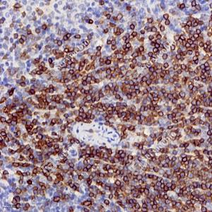 | IHC检测CD3蛋白(货号 GB11014). 样品: 大鼠脾, 4%多聚甲醛 (货号G1101) 固定12-24小时. 抗原修复: 柠檬酸抗原修复液(干粉, pH 6.0) (G1201), 高压锅均匀喷气计时2分钟. —抗: 1: 1000稀释, 4℃ 孵育过夜. 二抗: HRP标记山羊抗兔IgG (H+L) (货号GB23303), 1: 200稀释, 室温孵育1小时. |