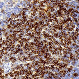 | IHC检测CD3蛋白(货号 GB11014). 样品: 人扁桃体, 4%多聚甲醛 (货号G1101) 固定12-24小时. 抗原修复: 柠檬酸抗原修复液(干粉, pH 6.0) (G1201), 高压锅均匀喷气计时2分钟. —抗: 1: 1000稀释, 4℃ 孵育过夜. 二抗: HRP标记山羊抗兔IgG (H+L) (货号GB23303), 1: 200稀释, 室温孵育1小时. |