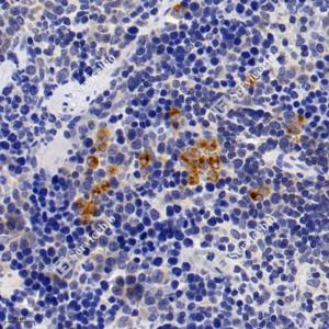 IHC检测Fc epsilon RI/FCER1A蛋白(货号 GB113166). 样品: 大鼠脾, 4%多聚甲醛 (货号G1101) 固定12-24小时. 抗原修复: 柠檬酸抗原修复液(干粉, pH 6.0) (G1201), 98℃, 20分钟. —抗: 1: 900稀释, 4℃ 孵育过夜. 二抗: HRP标记山羊抗兔IgG (H+L) (货号GB23303), 1: 200稀释, 室温孵育1小时. |