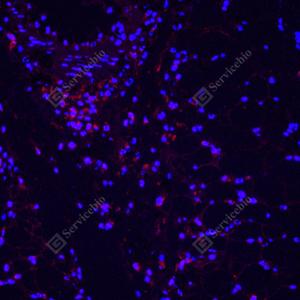 IF检测CD8 alpha蛋白(货号 GB11068)(红色). 样品: 小鼠脾, 4%多聚甲醛 (货号G1101) 固定12-24小时. 抗原修复: Tris-EDTA抗原修复液(pH 9.0) (G1203), 98℃, 20分钟. 封闭: 3% BSA(货号GC305010)的PBS溶液, 室温孵育30分钟. —抗: 1: 200稀释, 4℃ 孵育过夜. 二抗: Cy3标记山羊抗兔IgG (H+L) (货号GB21303), 1: 300稀释, 室温孵育1小时. |
