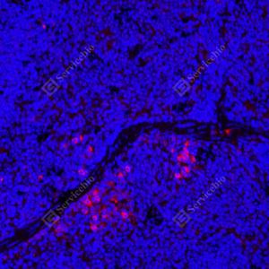IF检测CD8 alpha蛋白(货号 GB11068)(红色). 样品: 大鼠淋巴结, 4%多聚甲醛 (货号G1101) 固定12-24小时. 抗原修复: Tris-EDTA抗原修复液(pH 9.0) (G1203), 98℃, 20分钟. 封闭: 3% BSA(货号GC305010)的PBS溶液, 室温孵育30分钟. —抗: 1: 200稀释, 4℃ 孵育过夜. 二抗: Cy3标记山羊抗兔IgG (H+L) (货号GB21303), 1: 300稀释, 室温孵育1小时. |