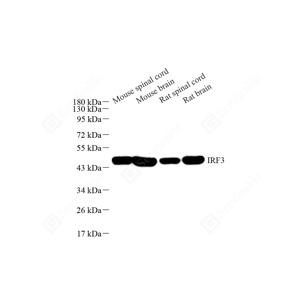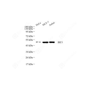 WB检测IRF3蛋白(货号 GB11368). 样品: 经RIPA裂解液(货号G2002)处理的蛋白质. 封闭: 封闭: 3%脱脂牛奶(货号GC310001)溶于TBST溶液, 室温孵育1小时. —抗: 1: 500稀释, 4℃ 孵育过夜. 二抗: HRP标记山羊抗兔IgG (H+L) (货号GB23303), 1: 5000稀释, 室温孵育1小时. |