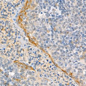 IHC检测FDCSP蛋白(货号 GB112394). 样品: 人扁桃体, 4%多聚甲醛 (货号G1101) 固定12-24小时. 抗原修复: 柠檬酸抗原修复液(干粉, pH 6.0) (G1201), 98℃, 20分钟. —抗: 1: 650稀释, 4℃ 孵育过夜. 二抗: HRP标记山羊抗兔IgG (H+L) (货号GB23303), 1: 200稀释, 室温孵育1小时. |