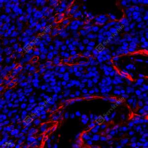 IF检测FDCSP蛋白(货号 GB112394)(红色). 样品: 人扁桃体, 4%多聚甲醛 (货号G1101) 固定12-24小时. 抗原修复: Tris-EDTA抗原修复液(pH 9.0) (G1203), 98℃, 20分钟. 封闭: 3% BSA(货号GC305010)的PBS溶液, 室温孵育30分钟. —抗: 1: 650稀释, 4℃ 孵育过夜. 二抗: Cy3标记山羊抗兔IgG (H+L) (货号GB21303), 1: 300稀释, 室温孵育1小时. |