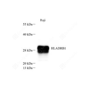WB检测HLA Class II DRB1蛋白(货号 GB115522). 样品: 经RIPA裂解液(货号G2002)处理的蛋白质. 封闭: 封闭: 3%脱脂牛奶(货号GC310001)溶于TBST溶液, 室温孵育1小时. —抗: 1: 300稀释, 4℃ 孵育过夜. 二抗: HRP标记山羊抗兔IgG (H+L) (货号GB23303), 1: 5000稀释, 室温孵育1小时. |