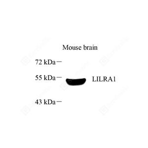 WB检测LILRA1蛋白(货号 GB113606). 样品: 经RIPA裂解液(货号G2002)处理的蛋白质. 封闭: 封闭: 3%脱脂牛奶(货号GC310001)溶于TBST溶液, 室温孵育1小时. —抗: 1: 1000稀释, 4℃ 孵育过夜. 二抗: HRP标记山羊抗兔IgG (H+L) (货号GB23303), 1: 5000稀释, 室温孵育1小时. |