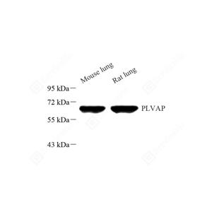 WB检测PLVAP/PV-1蛋白(货号 GB113141). 样品: 经RIPA裂解液(货号G2002)处理的蛋白质. 封闭: 3%脱脂牛奶(货号GC310001)溶于TBST溶液, 室温孵育1小时. —抗: 1: 2000稀释, 4℃ 孵育过夜. 二抗: HRP标记山羊抗兔IgG (H+L) (货号GB23303), 1: 5000稀释, 室温孵育1小时. |