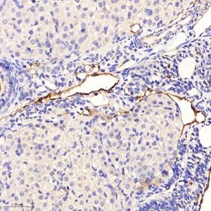 IHC检测PLVAP/PV-1蛋白(货号 GB113141). 样品: 小鼠卵巢, 4%多聚甲醛 (货号G1101) 固定12-24小时. 抗原修复: 柠檬酸抗原修复液(干粉, pH 6.0) (G1201), 98℃, 20分钟. —抗: 1: 2000稀释, 4℃ 孵育过夜. 二抗: HRP标记山羊抗兔IgG (H+L) (货号GB23303), 1: 200稀释, 室温孵育1小时. |