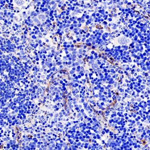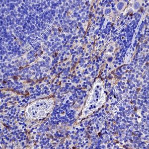 IHC检测PLVAP/PV-1蛋白(货号 GB113141). 样品: 小鼠脾, 4%多聚甲醛 (货号G1101) 固定12-24小时. 抗原修复: 柠檬酸抗原修复液(干粉, pH 6.0) (G1201), 98℃, 20分钟. —抗: 1: 2100稀释, 4℃ 孵育过夜. 二抗: HRP标记山羊抗兔IgG (H+L) (货号GB23303), 1: 200稀释, 室温孵育1小时. |